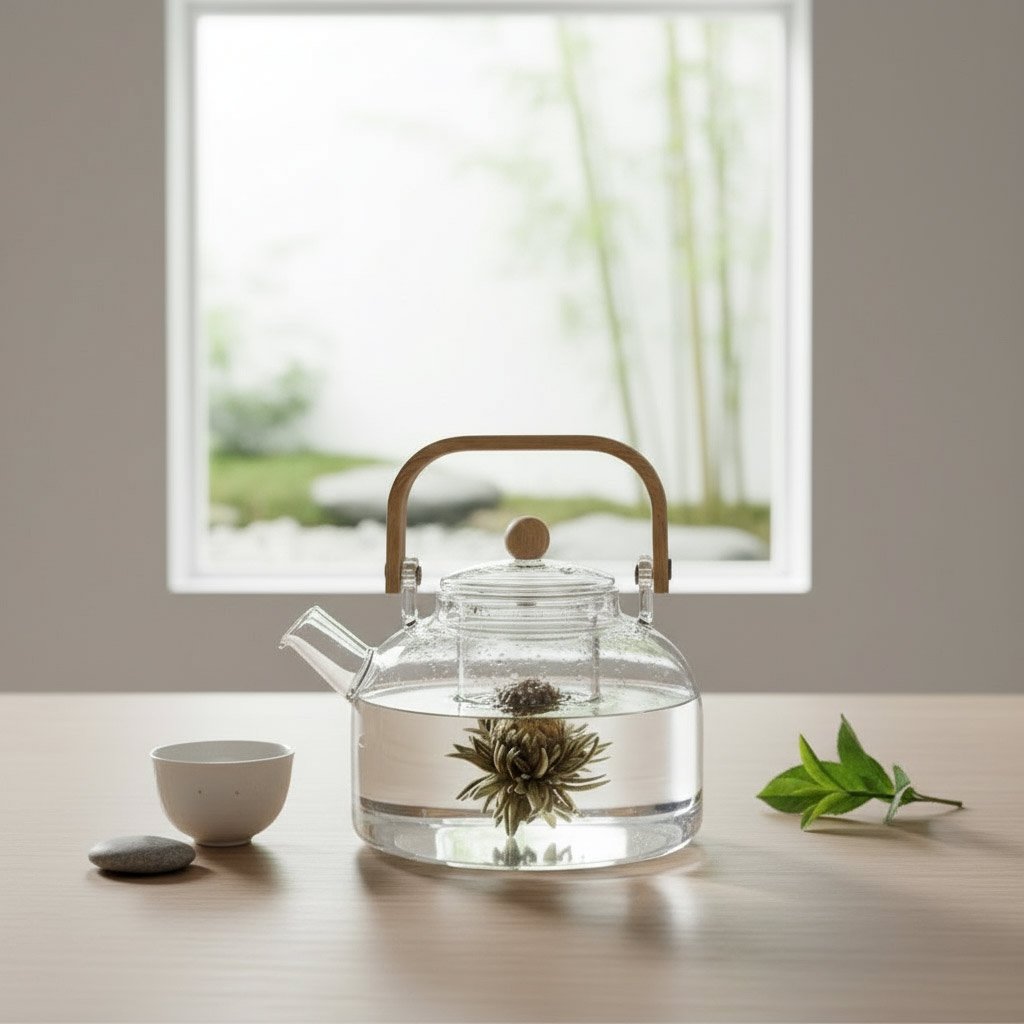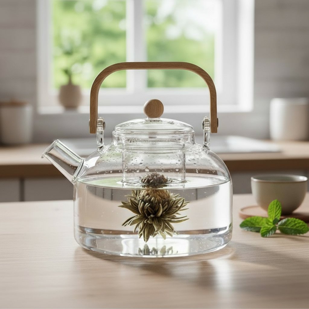 Elegant heat-resistant glass teapot perfect for showcasing blooming teas. Features a clear design, built-in infuser basket, and a stylish natural wood handle for a comfortable pour.