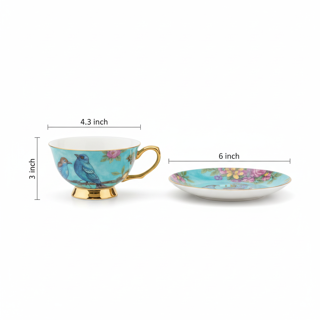 Embrace an elegant tea time with the Blue Bird Delight teacup and saucer set. This charming piece features a delicate bird and floral motif on a serene blue backdrop, while a prominent golden base and matching handle add a touch of timeless luxury. It’s a delightful addition to any collection, perfect for savoring a quiet moment.