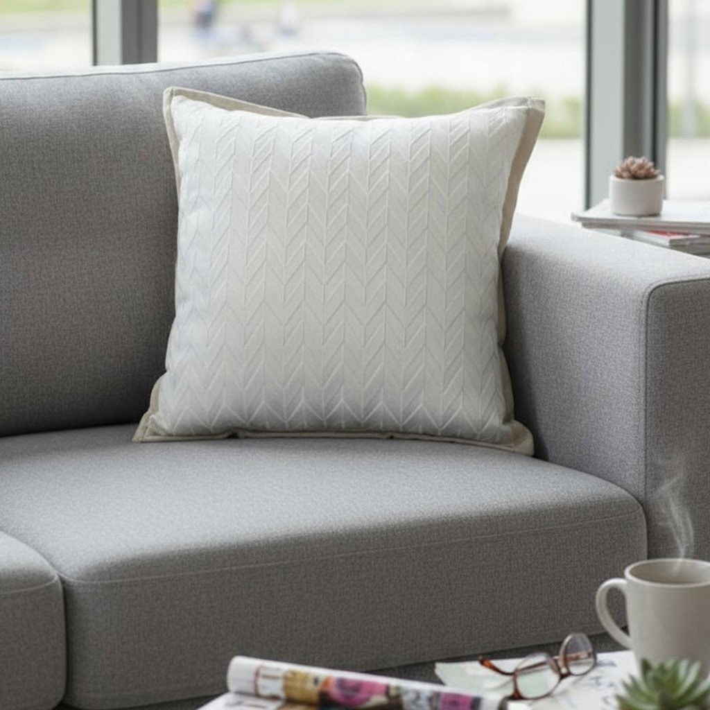 The Chevron Tide Cushion adds modern dimension with its subtle texture. This off-white pillow features a continuous, embossed chevron pattern that creates an elegant, wavelike visual effect, perfect for contemporary layering.