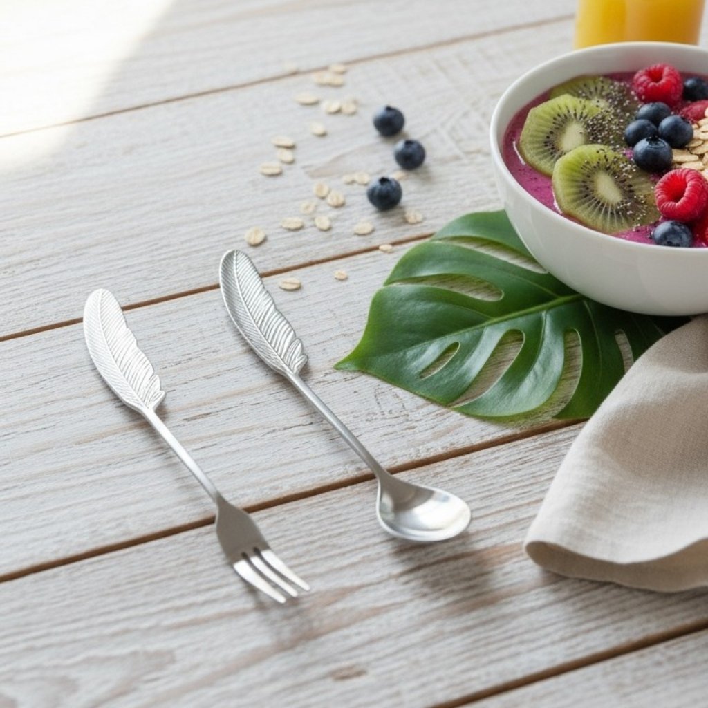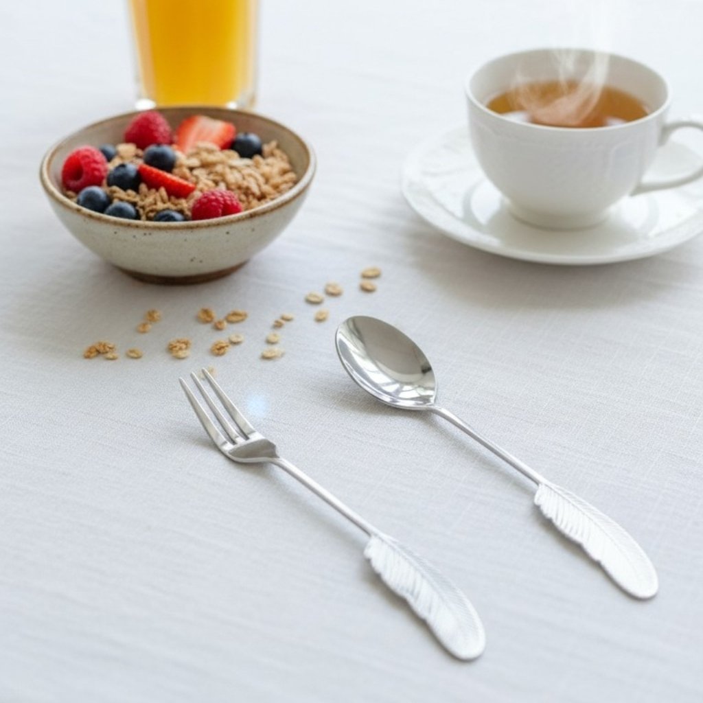 Adorn your table with the graceful beauty of the Feathered Elegance silver spoon and fork set. Each piece features a unique, sculpted handle that captures the delicate detail of a feather. The sleek, polished silver finish brings a touch of modern sophistication to any meal, turning everyday dining into a work of art.