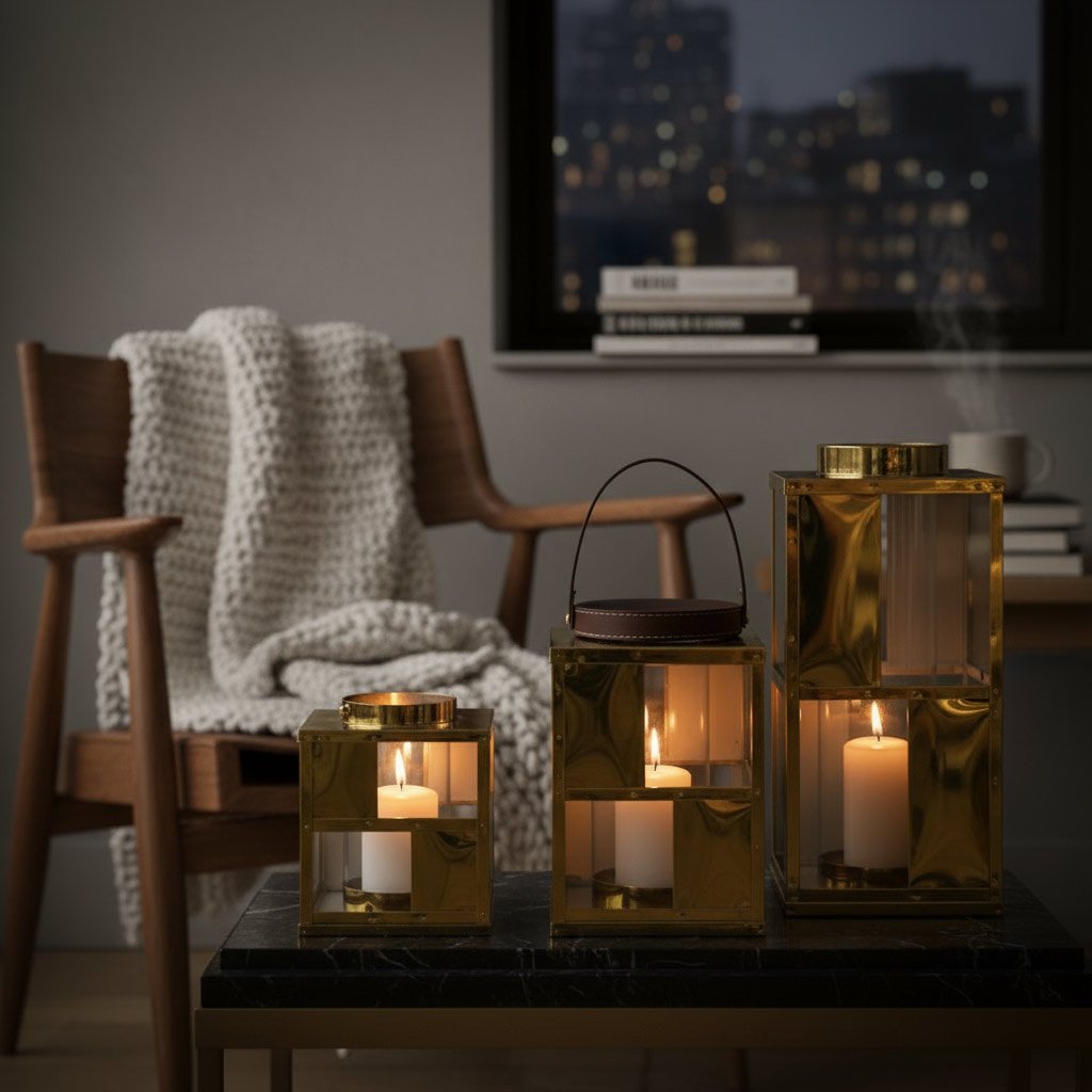 A statement set in high-polished gold, the *Flame Rise* lanterns feature a sleek, architectural design that multiplies the candle’s glow into a dazzling infinity of reflections.