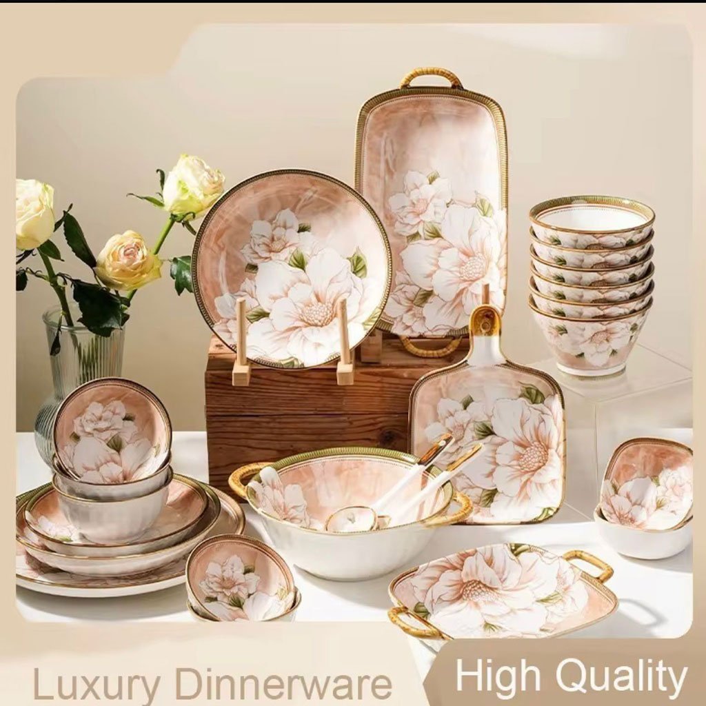 The Floral Opulence Dinnerware Set offers a luxurious and complete 21-piece service for six, crafted from fine, elegant ceramic. Each piece features a sophisticated peach-marbled interior and a stunning, large white floral bloom motif, all accented by an exquisite gold-trimmed rim. This collection brings a touch of vintage romance and opulent charm to every meal, perfect for creating a memorable tablescape.