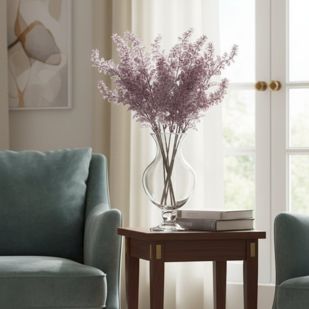 The Lavender Plume Flower is a graceful and elongated individual faux stem, perfect for adding height and a soft, textured pop of color to your arrangements. This stem features a tapering, brush-like head composed of numerous fine filaments in a delicate dusty lavender or mauve-purple hue. Its feathery, ‘plume’ texture provides a beautiful organic contrast when mixed with traditional blooms or used alone for a modern, minimalist look in a tall vase.
