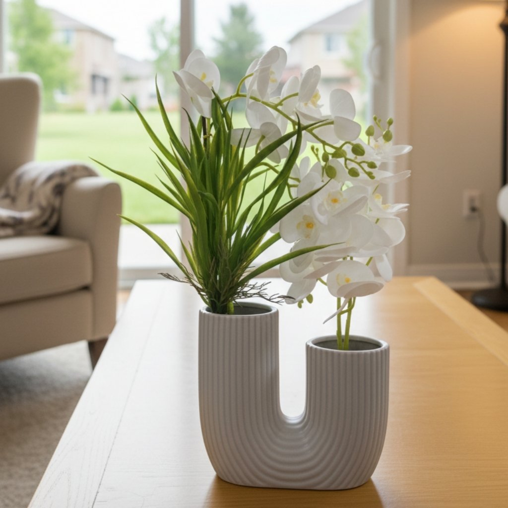 The Loop Flower Pot is a distinctive ceramic piece featuring a unique U-shaped double-chamber design with a modern, ribbed texture. This sculptural pot serves as a statement piece for displaying floral arrangements. It is Available in two stunning color combinations: