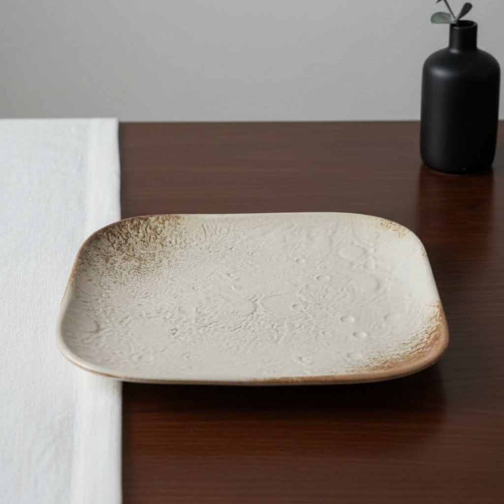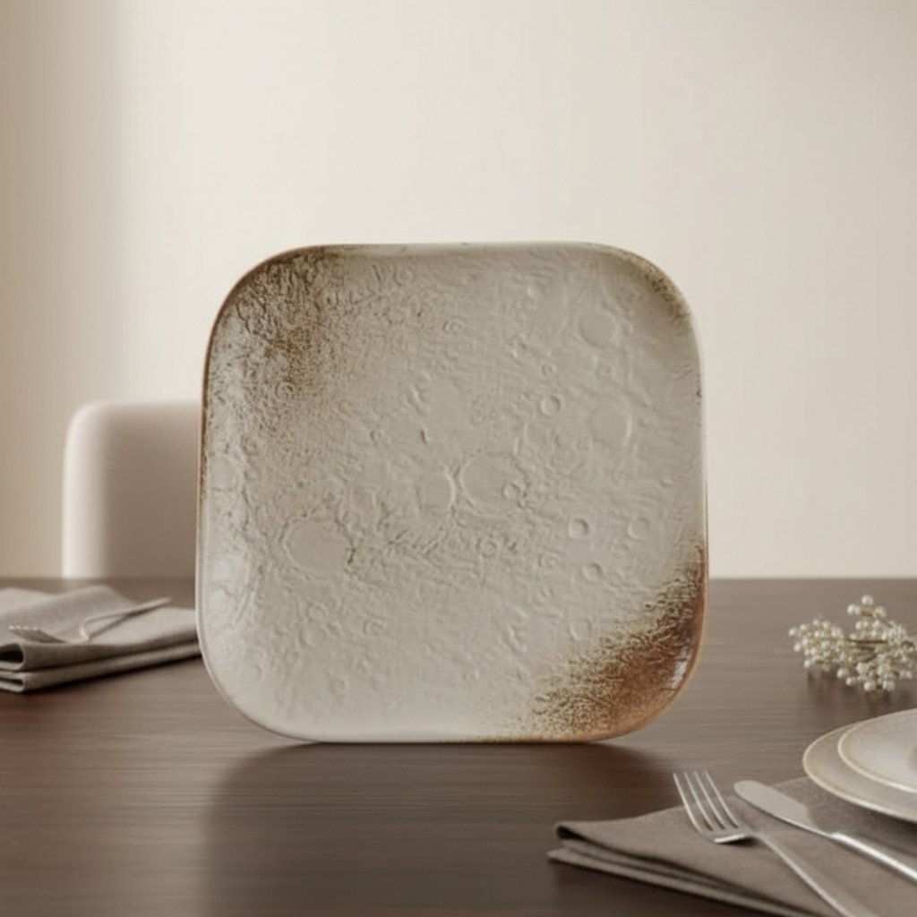 The Lunar Square Plate brings a unique, textural depth and modern shape to your dining presentation. Crafted from robust Ceramic Stone, this plate features a distinctive square silhouette with gently curved edges. The surface is defined by its beautiful, slightly textured finish (reminiscent of the moon’s surface or hammered metal), which catches the light and adds an organic, artisanal feel. Perfect for serving appetizers, desserts, or small entrees, this plate is an ideal choice for those who appreciate contemporary design and earthy sophistication.