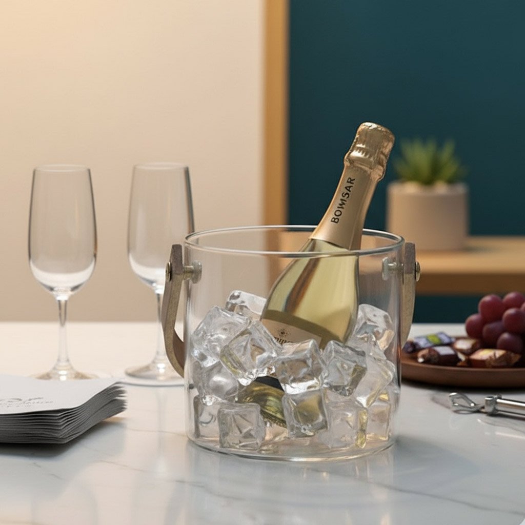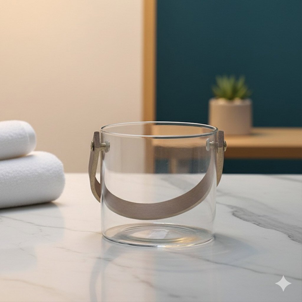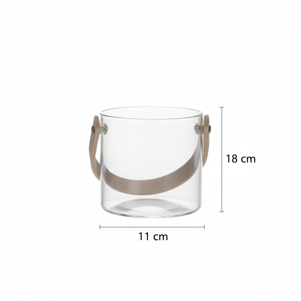 Your perfect partner for effortless entertaining, the Mini Bar Buddy is a stylish ice bucket designed for intimate gatherings. It pairs sturdy, textured glass with a chic leather strap handle, making it easy to carry. This modern accessory brings a sophisticated touch of cool convenience to any mini bar or countertop.