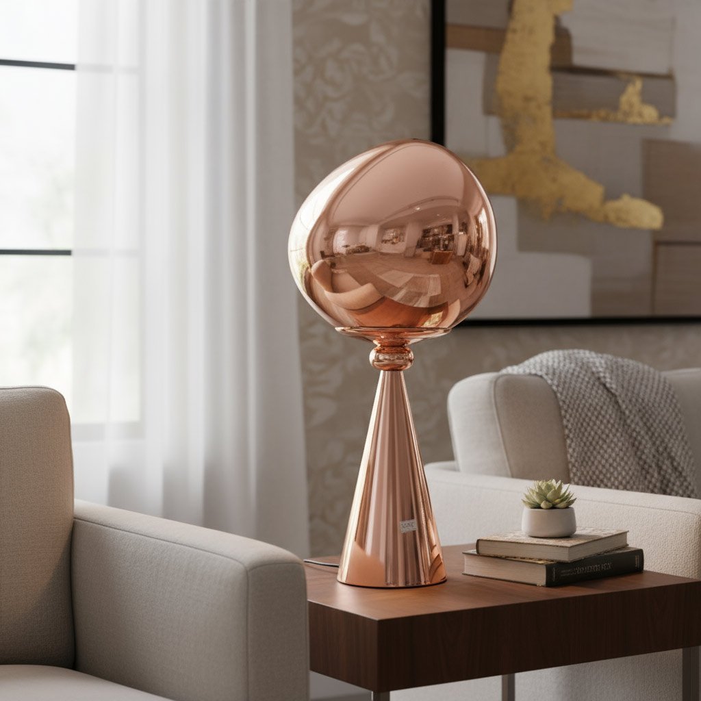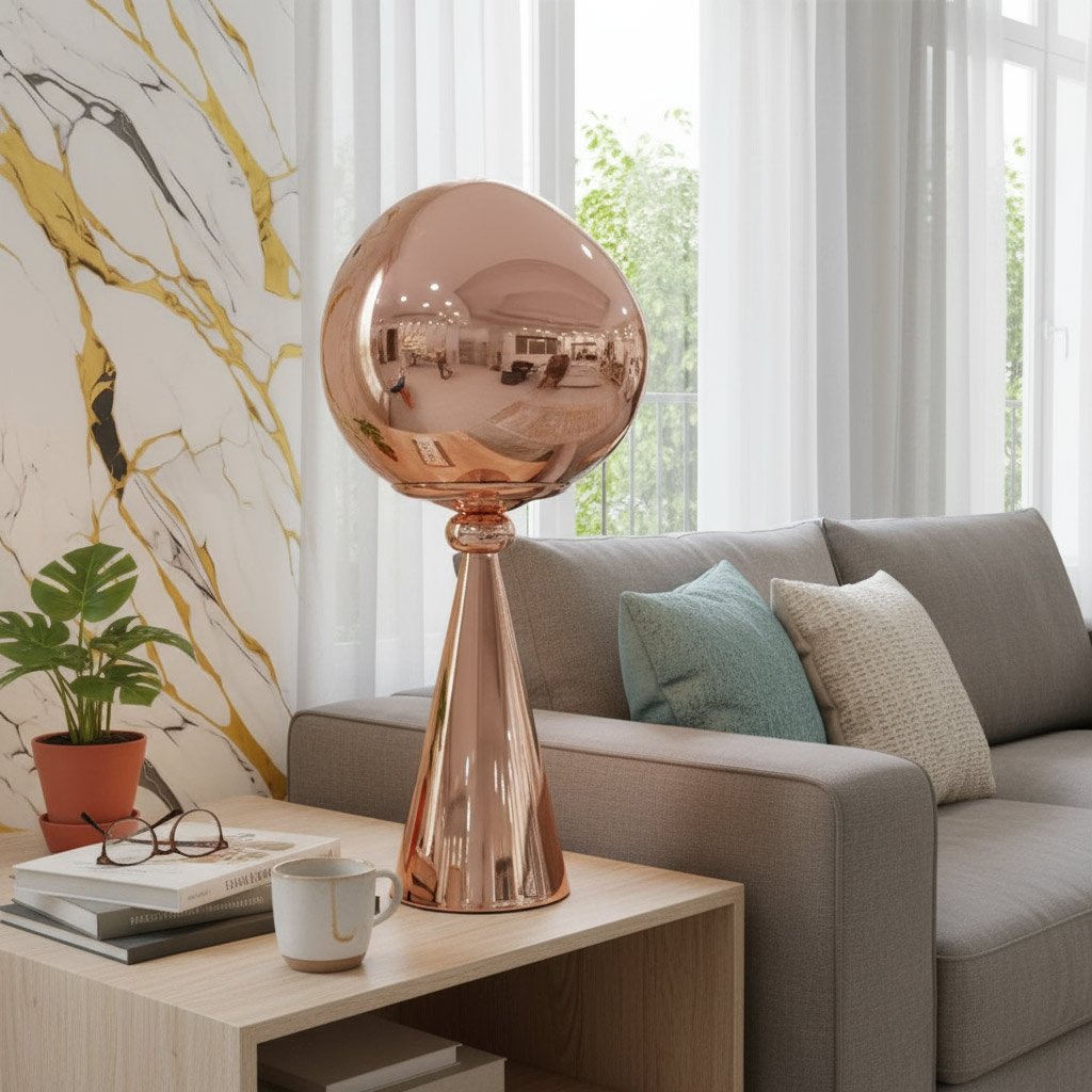 Make a contemporary statement with the Rose Gold Balloon Table Lamp. This unique piece features a highly reflective, oversized globe shade atop a conical base, all finished in a striking, polished rose gold tone for maximum modern impact.