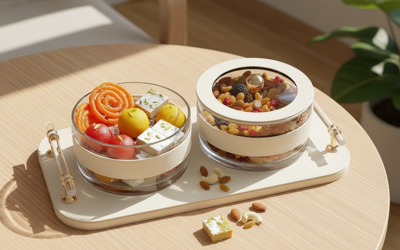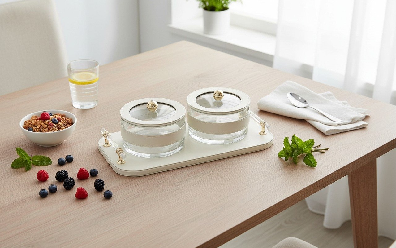 The jars are presented on a coordinating rectangular serving tray finished in the same creamy material. The tray is further enhanced by decorative, clear acrylic or glass handles with gold-tone hardware at each end, adding a touch of opulent glamour. Perfect for serving sweets, nuts, or dry fruits, this set is ideal for entertaining or simply adding a polished look to your kitchen or living area.