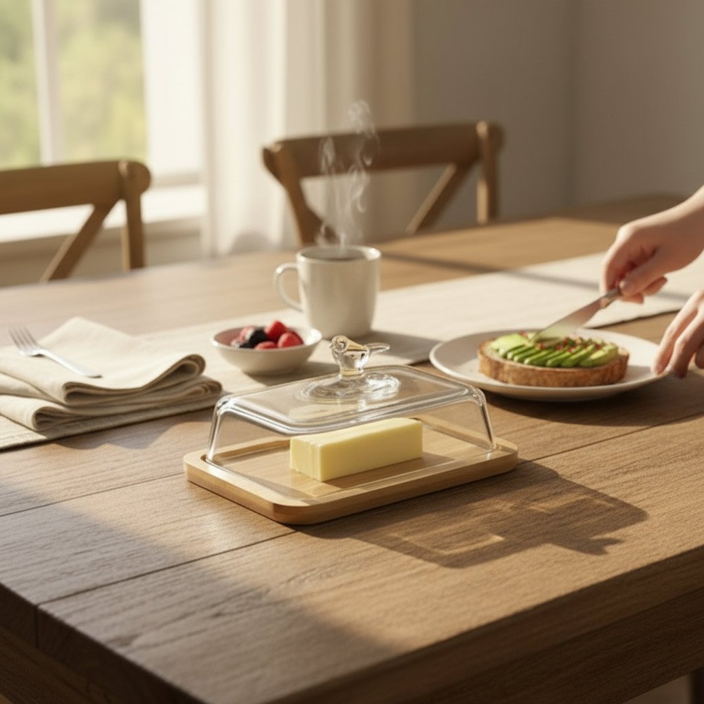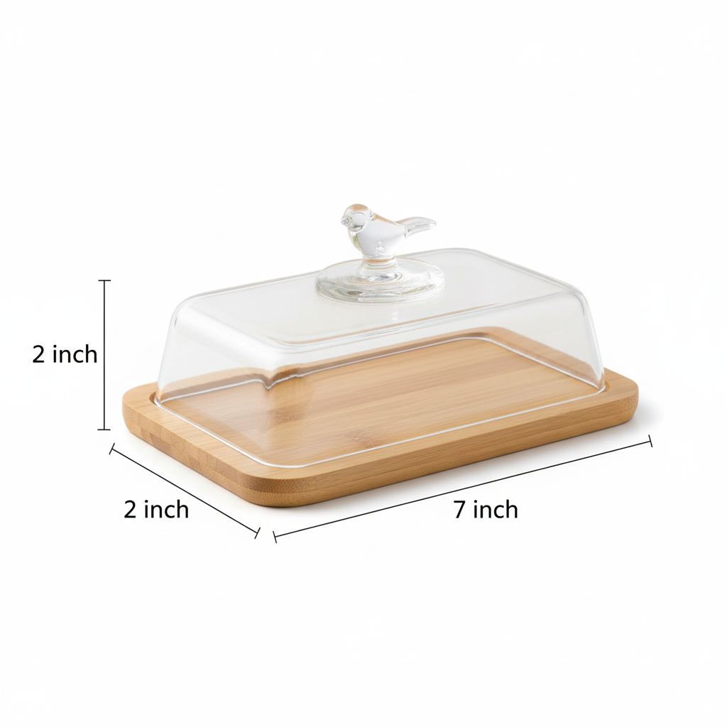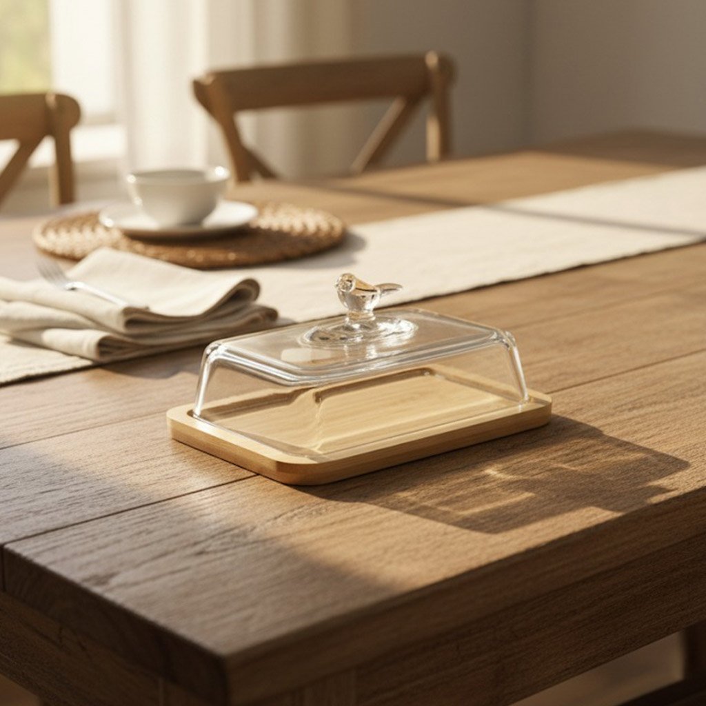 Bring a touch of whimsical charm to your breakfast table with *The Songbird Butter Bliss*. This delightful butter dish features a sleek wooden base and a clear glass dome topped with a sweet, sculpted songbird handle. It’s the perfect blend of natural simplicity and elegant detail, keeping your butter fresh and ready for service.